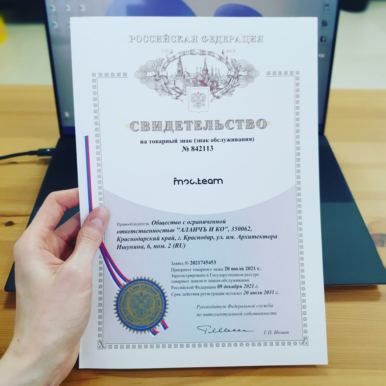 Я уже писал в итогах года, что решил зарегистрировать товарный знак для нашей CRM-системы moo.team. А вчера получил оригинал свидетельства об этом.