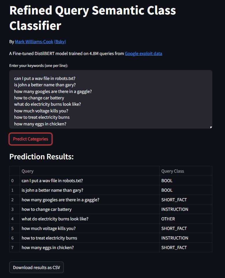 Модель DistilBERT, обученная на 4..8 млн реальных запросов из данных Google и семантических классов от Google, теперь может классифицировать ваши запросы по одному из восьми различных типов: