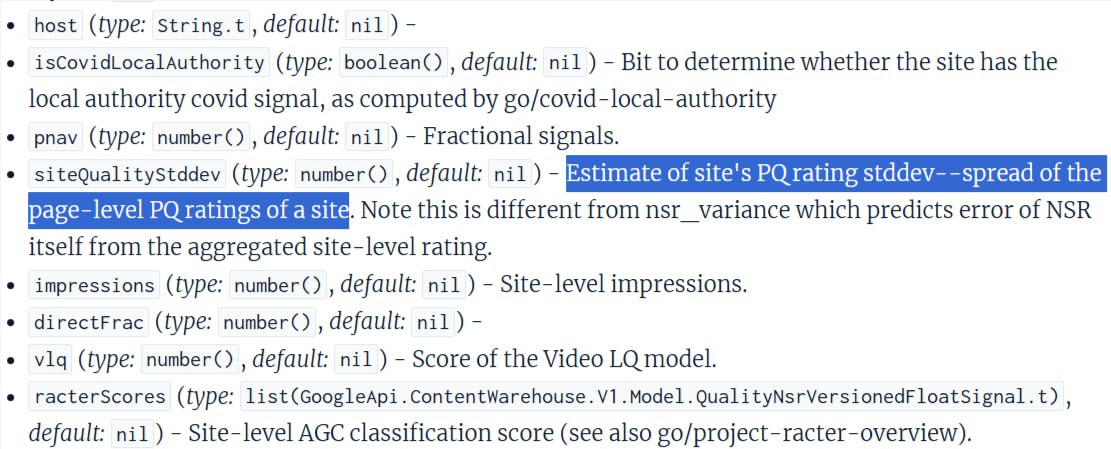 Определенная в сливе как "оценка стандартного отклонения рейтинга PQ сайта", эта переменная подтверждает, что Google вычисляет конкретное целое число pqData для каждого URL — "Цифровой Двойник" оценок живых асессоров, сгенерированный через Supervised Machine Learning.